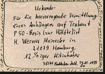 Hier ein eigener Bericht vom Hamburger Sammler Werner Meinecke: Im Jahre 1993 bekam ich einen original halben Trabant 500ter als Anhänger angeboten. Leider konnte ich Ihn damals nicht selber übernehmen, deshalb hatte ich einige Freunde gefragt und dann den Anhänger weiter vermittelt. Als Dank bekam ich dann eine Urkunde mit einer 12 % tigen Mitinhaber Überschreibung. Leider habe ich dann aber nichts mehr von dem (unserem) Anhänger gehört.- Ich will diese Vorstellung aber zum Anlass nehmen, wieder Kontakt auf zu nehmen! Brief ist unterwegs!