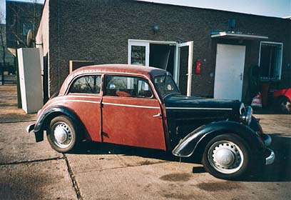 allernötigsten Wartungen vornehmen ! Platz- und Geldmangel waren der Grund warum er bei mir anfragte, ob er das Auto bei mir unterstellen könne. Ich bin dann mit meinem Chevy als Zugmaschine und Anhänger nach Berlin gefahren um das gute Stück abzuholen ! Aus dem Unterstellen ist dann später ein Verkauf geworden. Seit der Zeit steht er nun bei mir, einmal haben wir den Motor zum Laufen gebracht, aber in nicht allzu ferner Zukunft, hoffentlich 2002, wird dieses Schmuckstück in die Total-Restauration gehen und danach dann hoffentlich im alten Glanz, zweifarbig schwarz-rot, erstrahlen!