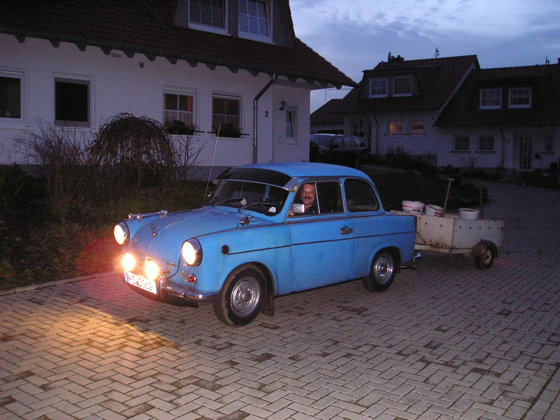 Mein Trabbi Auto ist Baujahr 4/59 AWZ P50 Fahrgestellnummer 5007791.Ich habe es 1989 für 4000 Ostmark als "Schrotthaufen" gekauft, da es ja keine anderenbezahlbaren Autos gab.Ich bin der 13. Besitzer. Seit 1989 bin ich ca. 160 000 km gefahren.Das Auto ist täglich im Einsatz und war nie stillgelegt. Ich fahre mit dem Auto in Kassel täglich zur Arbeit.(ca. 30 km täglich,außer bei totalen Regenwetter oder Schnee) Alle defekten und verschlissennen Teile sind nach und nach mit viel Mühe ersetzt und getauscht worden, soweit beschaffbar.