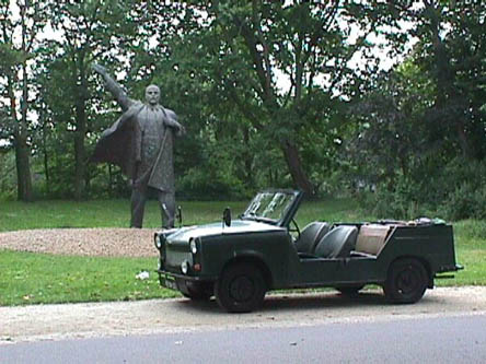 Für ein Kunstfestival gab es eine richtige Lenin Statue. Hier ein Foto mit dem Trabant Kübelwagen
