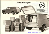 Trabant Lieferwagen In den 60er Jahren importierte man viele Kleinwagen steuerfrei als Lieferwagen (Die Zoll Gebühr betrug damals in Finnland ca. 30 % vom Neuwert) Nachdem ein solches Auto dann 2 Jahre angemeldet war, konnte man es als PKW ummelden. Größtenteils wurden dann in diese Lieferwagen eine Rückbank, sowie hintere Seitenfenster eingebaut. Dieses Auto ist der einzige in Finnland zugelassene Trabant Lieferwagen. Er ist einer der ersten in Meraane hergestellten P 601 Lieferwagen, Baujahr 1966, Fahrgestellnummer 1800049.