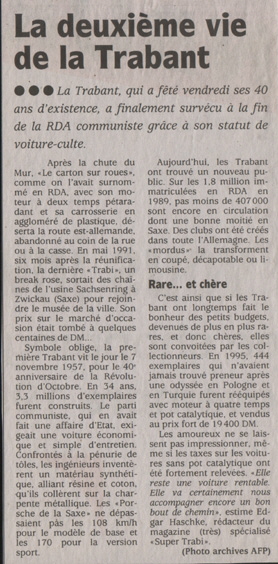 Es tut sich was: Ein erster Zeitungsbericht aus Frankreich. Auch dort wurde von der Feier am 7. Novenber 1997 zum “40. Jahrestag vom Trabant” Zwickau berichtet.
